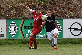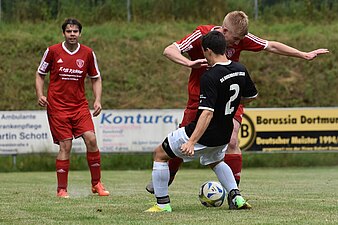 Die junge SG-Elf blieb dennoch bemüht und kam zu ersten Torabschlüssen. Mehrmals scheiterten Lamnek, Kucharski oder Buß am glänzend aufgelegten Gästehüter Hargens. Insbesondere Lamneks Sololauf und überlegter Abschluss sprang unglücklich durch einen Platzfehler noch knapp am Tor vorbei. Die Hausherren brachten zudem Schiedsrichter Sazak mit unnötigen Meckereinlagen und übermotiviertem Einsteigen gegen sich auf, der früh gelbe Karten verteilte. So ging es mit der kanppen Gästeführung in die Halbzeitpause. In der Pause brachte Spielertrainer Hohner frische Kräfte auf der rechten Seite. Diese Pause nutzten die Gäste, um sich zu sortieren und kamen wacher aus der Kabine. Ein schöner Abschluss verpasste sein Ziel denkbar knapp am langen Pfosten. Auf der Gegenseite sprang ein präziser Kucharski-Kopfball von der Lattenunterseite hinter der Linie auf und wieder raus. Nach kurzer Diskussion entschied der Unparteiische auf Tor.