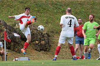 In einem mäßigen B-Klassen-Spiel gingen die Gäste zum Schluss nicht unverdient als Sieger vom Platz. Peesten versuchte von Beginn an, das Spiel in die Hand zu nehmen. Teilweise schöne Kombinationen wurden aber im Abschluss zu hektisch oder teils kläglich vergeben. Die Heimelf dagegen stand sehr tief und versuchte immer wieder durch Witzgall und Ziebis schnelle Konter zu setzten. Als SSV-Stürmer Schott einen Freistoß schnell ausführte, brachte Zacharias seine Farben in Front. Doch zu früh gefreut. Warum auch immer, pfiff Schiedsrichter Gäbelein den Freistoß zurück. Es blieb bis zur Halbzeit beim torlosen Remis. Der zweite Abschnitt begann kurios. Nach einer Hammond-Ecke brachte Dippold Peesten mit 1:0 per Kopf in Führung. Doch nur 3 Minuten später gelang Kirchleus der Ausgleich. Nach schönem Zuspiel von Klaus Michel, enteilte Ziebis der kompletten Abwehr und ließ auch Torwart Braunersreuther keine Chance - 1:1 !!! Die nächsten Minuten spielten sich fast nur im Mittelfeld ab. Fehlpässe beider Mannschaften waren jetzt an der Tagesordnung. Erst als Pichl die Gäste per berechtigten Handelfmeter wieder in Führung brachte, glaubte der SSV wieder an einen Auswärtsdreier. Kirchleus schmiss in den letzten Minuten alles nach vorne, ohne jedoch ernsthaft für Torgefahr zu sorgen. Den Schlusspunkt setzte Schott, als er nach einem Konter den Heimtorwart umkurvte und ins leere Tor einschob. Alles in Allem ein glücklicher Sieg der Gäste, welcher aber auf Grund der geschlosseneren Mannschaftsleistung in Ordnung geht.