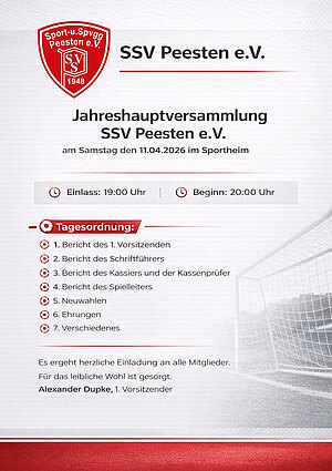 am 11.04.2026 steht unsere ordentliche Jahreshauptversammlung im Sportheim des SSV Peesten, inkl. Neuwahlen an. Nach 16 Jahren Vorstandsarbeit wird das meine voraussichtlich letzte Versammlung sein und ich würde mich freuen, möglichst viele aktuelle, aber auch alte Weggefährten im Sportheim willkommen heißen zu dürfen. Von daher sende ich schon heute die Einladung inkl. Tagesordnung über alle Kanäle. Auch in der BR wird am kommenden Wochenende satzungsgemäß geladen. Ich freue mich auf schöne Stunden und zahlreiche Ehrungen, jahrelang verdienter Mitglieder. Ich freue mich auf den 11.04.!